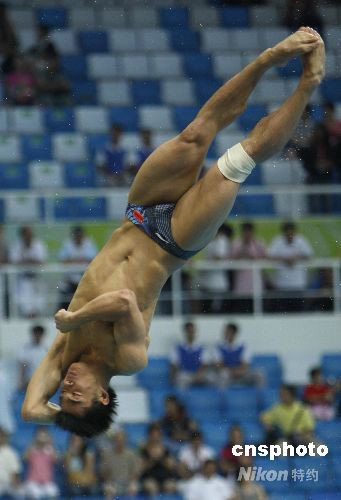 8月19日晚,在國家游泳中心“水立方”進(jìn)行的北京奧運(yùn)會(huì)男子3米跳板決賽中,中國選手何沖以572.90分奪得金牌,中國代表團(tuán)金牌總數(shù)增至43枚。 中新社發(fā) 杜洋 攝