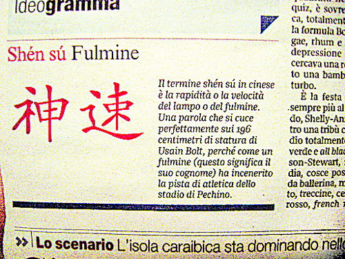 這個(gè)“漢字”專欄自北京奧運(yùn)會(huì)開幕之日起,每天一期、每期一詞,每個(gè)詞都標(biāo)注拼音,引出一段新聞。如8月8日的專欄詞匯是“鳥巢”,在這兩個(gè)漢字下面用意大利語(yǔ)解釋了“鳥巢”在漢語(yǔ)中的本意,介紹了北京的國(guó)家體育場(chǎng),并配上焰火照耀下的“鳥巢”夜景圖片。其后的專欄相繼刊登了“文身”、“興奮劑”、“球門”、“地區(qū)”、“神速”等漢語(yǔ)詞匯。在漢字“興奮劑”下報(bào)道的新聞是:奧組委為實(shí)現(xiàn)“干凈的奧運(yùn)會(huì)”已向興奮劑宣戰(zhàn),北京設(shè)立了由220名高級(jí)專家組成的超級(jí)檢測(cè)中心,每天檢測(cè)數(shù)量達(dá)250例。“神速”一詞解讀的新聞是:這個(gè)在漢語(yǔ)中意為閃電般快速的詞,恰如其分地描繪了飛人博爾特17日晚破百米紀(jì)錄的情景。這名身高196cm的運(yùn)動(dòng)員,以其閃電般的速度征服了北京國(guó)家體育場(chǎng)內(nèi)的所有觀眾。(記者穆方順)