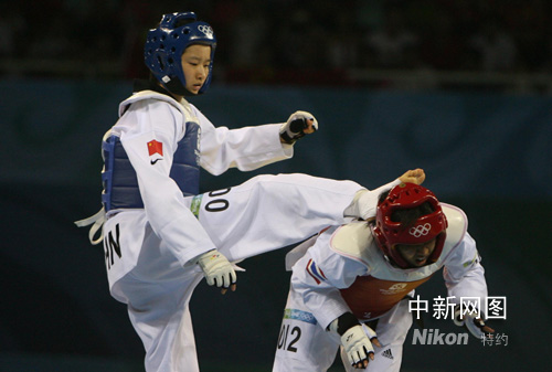 8月20日,中國(guó)選手吳靜鈺在北京奧運(yùn)會(huì)跆拳道女子49公斤以下級(jí)決賽中戰(zhàn)勝泰國(guó)選手布特雷·貝德蓬,奪得冠軍。中新社記者 武仲林 攝