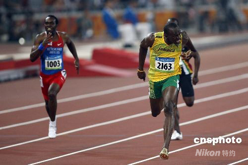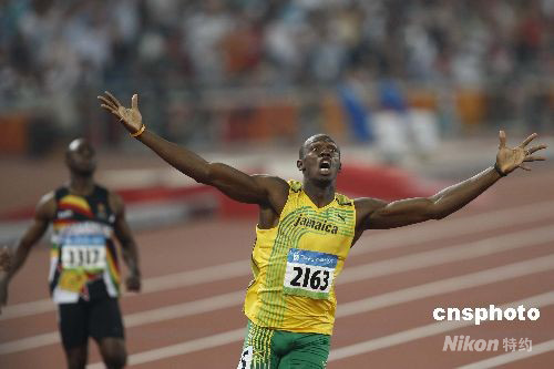8月20日晚,國(guó)家體育場(chǎng)舉行的北京奧運(yùn)會(huì)男子200米決賽中,牙買加選手尤塞恩·博爾特以19.30創(chuàng)造新的世界紀(jì)錄并獲得金牌。這是他在本屆奧運(yùn)會(huì)上繼百米金牌后奪得的第二枚金牌。 中新社發(fā) 盛佳鵬 攝