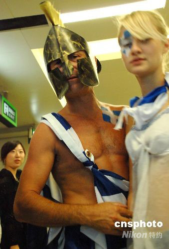 8月22日晚,一身披希臘國旗、頭戴古希臘“勇士”頭盔的希臘男子和一名身披希臘國旗的希臘姑娘在北京地鐵10號線搭乘地鐵,引來周邊眾多乘客好奇的目光。中新社發(fā) 楊慧峰 攝