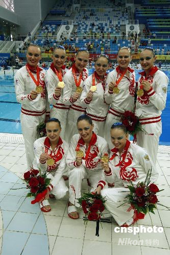 8月23日,俄羅斯花樣游泳隊(duì)在北京奧運(yùn)會(huì)集體項(xiàng)目決賽中獲得金牌。中新社發(fā) 杜洋 攝