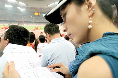 在鳥巢觀看女子撐桿跳高決賽的湯燦,瞧這架勢(shì),似乎很專業(yè),還準(zhǔn)備了一份小資料,在研究什么呢?