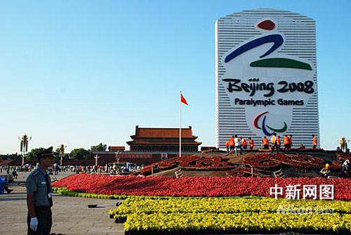 9月1日,殘奧會會徽“天地人”造型亮相天安門廣場。為了迎接第13屆殘奧會的到來,天安門廣場的奧運花壇在今天上午成功轉換為殘奧會花壇。中心花壇的中國印被殘奧會的會徽所替代。35萬盆補充鮮花亮相天安門廣場。記者:楊慧峰 攝