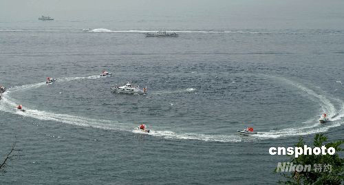 圖為殘奧火炬?zhèn)鬟f經(jīng)過大連濱海路時(shí),海上表演項(xiàng)目為傳遞活動(dòng)增色。 中新社發(fā) 宋太盛 攝