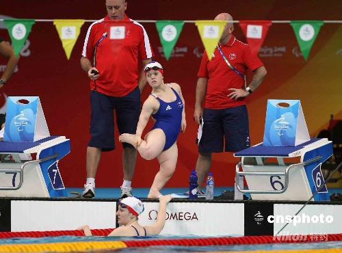 9月7日,北京殘奧會首日游泳比賽在“水立方”舉行,通過上午的預(yù)賽,晚間將產(chǎn)生16枚金牌。圖為參賽選手在下水前做準(zhǔn)備活動。中新社發(fā) 任晨鳴 攝