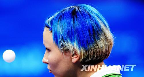 9月8日,斯洛文尼亞選手馬泰婭·平塔爾在比賽中。當日,馬泰婭·平塔爾在北京2008年殘奧會乒乓球女子單打F3A組比賽中以3比2戰(zhàn)勝法國選手范妮·貝特朗。賽場上,多彩的發(fā)型使她更加青春靚麗。新華社記者 徐家軍 攝