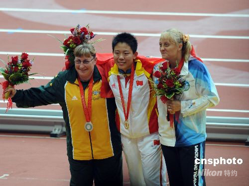 9月9日,北京殘奧會田徑比賽在國家體育場進行,在女子鐵餅F35-36級決賽中,中國選手F36級的吳晴以25米80奪得金牌,并打破殘奧會紀錄,另一名中國選手F35級的白旭紅以23米42獲得第5名。銀牌和銅牌被F36級的澳大利亞選手卡思-普勞德富特和烏克蘭選手阿拉-馬爾奇克獲得,她們的成績是23米91和22米15。 中新社發 杜洋 攝