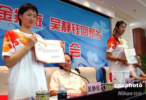 9月8日,江西省景德鎮(zhèn)市熱烈歡迎北京奧運會冠軍金紫薇、吳靜鈺載譽回鄉(xiāng),景德鎮(zhèn)市婦聯(lián)和團委分別授予兩人“三八紅旗手標兵”稱號和“五四青年獎章”。在此次北京奧運會上,金紫薇和吳靜鈺分別奪得賽艇女子4人雙槳項目和跆拳道女子49公斤級比賽冠軍。 中新社發(fā) 程萬海 攝