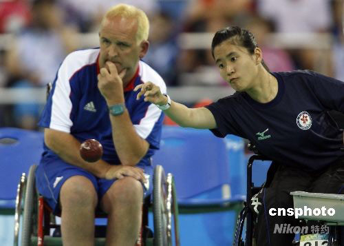 9月9日,中國香港選手郭海瑩在硬地滾球混合單打-BC2決賽中,戰勝英國選手奈杰爾-莫里,為中國香港隊摘得殘奧會首枚金牌。中新社發 杜洋 攝