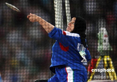 9月10日晚,北京殘奧會田徑各項比賽繼續在北京奧林匹克公園內的國家體育場-鳥巢舉行,各國女子大力士在鐵餅比賽中竭盡全力向冠軍發起沖擊。圖為頭戴黑色頭巾的科威特選手瑪哈·謝拉揚奮力將鐵餅擲出。 中新社發 任晨鳴 攝