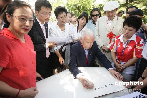 圖為薩馬蘭奇正在為東四奧林匹克社區(qū)博物館題字。中新社發(fā) 郝飛 攝