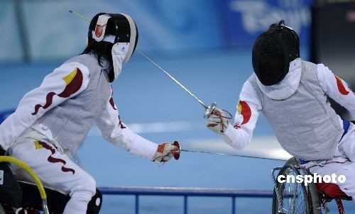 9月14日,北京殘奧會(huì)輪椅擊劍在北京國(guó)際會(huì)議中心擊劍館進(jìn)入首個(gè)比賽日,男子個(gè)人花劍A級(jí)決賽上演了一場(chǎng)“中國(guó)德比戰(zhàn)”,最終3號(hào)種子葉如意(右)15-12戰(zhàn)勝隊(duì)友6號(hào)種子張蕾,奪得金牌。