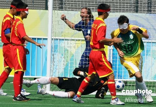 9月15日下午,北京殘奧會(huì)五人制(盲人)足球預(yù)賽最后一輪比賽在北京奧林匹克公園內(nèi)的橄欖球場舉行,此前均保持全勝紀(jì)錄的中國隊(duì)與巴西隊(duì)相遇,巴西隊(duì)10號里卡多·阿爾維斯率先攻破中國隊(duì)大門;中國隊(duì)9號隊(duì)長王周彬下半時(shí)破門得分。最終雙方以1比1戰(zhàn)平,攜手晉級決賽。中新社發(fā) 任晨鳴 攝
