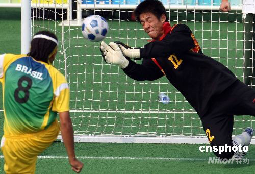 9月17日下午,北京殘奧會五人制足球決賽在北京奧林匹克公園內舉行,雅典殘奧會冠軍巴西隊依靠強大的實力,最后以2比1擊敗中國隊蟬聯冠軍。中新社發 任晨鳴 攝