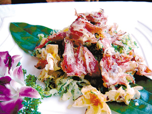 這道菜中共有三種味道,咸甜搭配,不會太膩。一是玫瑰花托,它是腌制過的,呈深紅色,吃起來就像蜜餞的感覺。另一種是雞蛋花,炸的雞蛋花沒有浸湯的滑,但是也很特別。還有一種是紐西蘭塘蒿,有種特殊的香味,比較清淡。