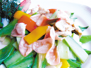 中國民間認為玫瑰有“行氣解郁,滋陰清熱”的功效。粉紅玫瑰是浪漫的象征,它嬌俏的外形和顏色容易讓人聯(lián)想到快樂、優(yōu)雅等詞匯。用粉紅玫瑰來做菜很討女生歡心,比如這道“北極深海玫瑰”就充滿浪漫的異國情懷。它里面還有水東芥菜、芥藍片、北極貝、雞腿肉等,北極貝爽口,玫瑰花瓣清香,各種材料搭配在一起清淡而可口。