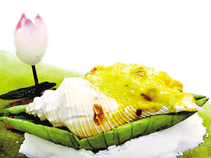 這道菜就是睡蓮花釀響螺。它用螺肉、鮮芡實、鮮淮山、沙葛及南瓜做餡,釀在響螺殼中焗香。這道菜的材料非常豐富,口感也很有層次。