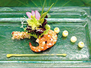 其實就是荷汁面拌遼參。這道菜的構思比較特別,它是用新鮮荷汁來打面條,打出來的面條質地細膩無瑕,滲透著荷葉獨有的清香、甘甜的氣息。蓮葉還有和血、清暑、去濕的功效。遼參味道爽脆、比較新鮮,也很適合夏天。