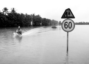 瓊海嘉積鎮多條道路遭受內澇。17日下午2時許,南國都市報記者徒步趟過3公里積水路段,來到上次受災嚴重的嘉積鎮橋頭村委會。該村委會通往嘉積的兩條道路豪華路、嘉博路部分路段積水超過1米。如果不是路邊豎立的路燈,很難分清哪里是道路,哪里是路邊水田。