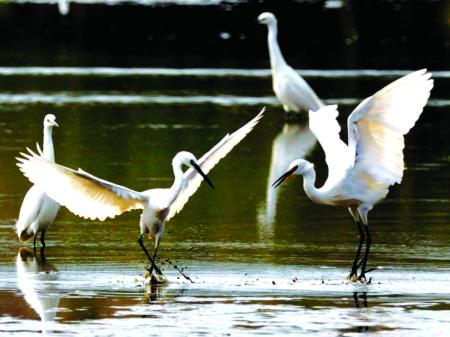 白鷺們聚集的寶地是一塊十余畝的魚塘。從25日開始,魚塘捕魚后放水“曬塘”,淺淺地露出了塘底。眼尖的白鷺們一眼就瞅見了漏網的小魚,紛紛呼朋引伴,來飽餐一頓。大的、小的,公的、母的都趕來了,一會兒,千余只白鷺齊聚。