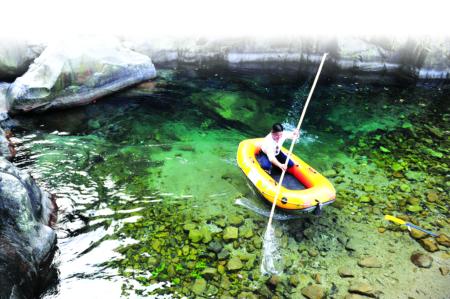 水清見(jiàn)底,看來(lái)不過(guò)一米。可用岸邊短竹竿一插,竟深有好幾米。欲渡此潭,必坐皮艇不可。同行人脫褲下水,想用竹竿勾來(lái),可惜竿還是不夠長(zhǎng),而水已沒(méi)至腰。