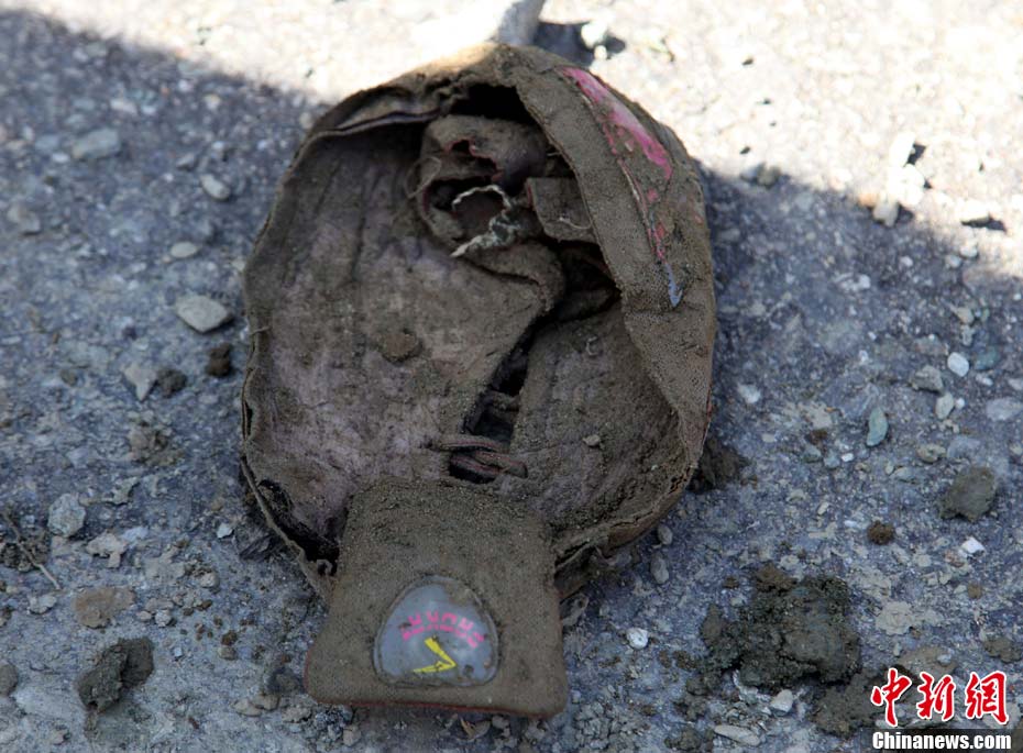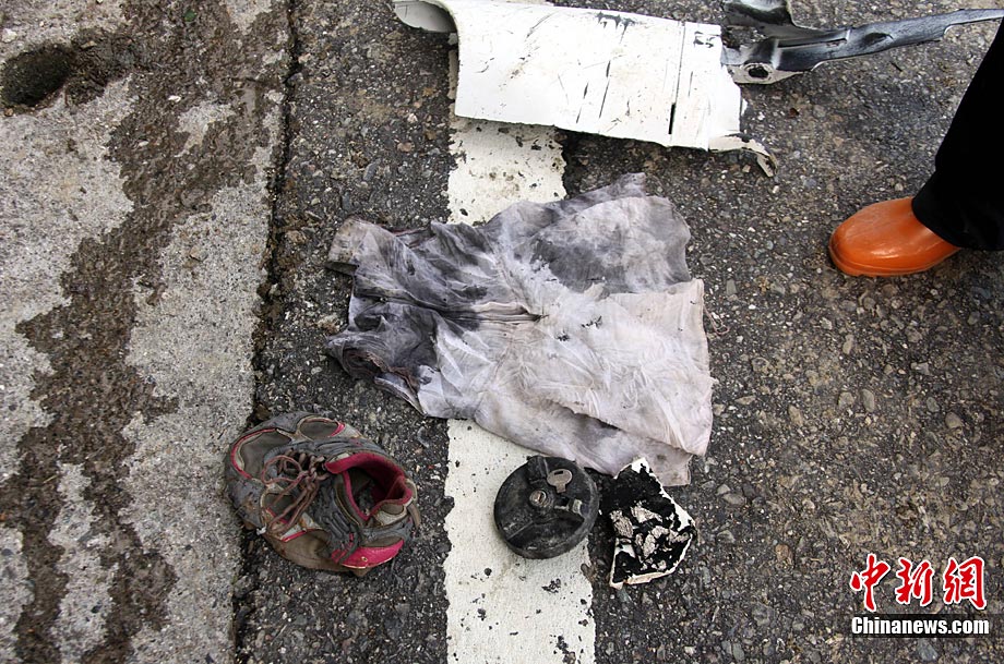 10月24日,未開挖前的蘇花公路塌方處旅游車被泥石流沖砸現場。中新社記者 陳立宇 攝