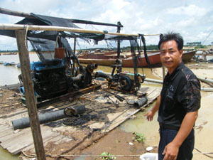 昨天上午11時許,記者與梁先生一同到現(xiàn)場了解情況。梁先生的金江沙場位于定安定城鎮(zhèn)和海口新坡鎮(zhèn)交界處,已經(jīng)暫停作業(yè),工人們在工棚休息。記者在采沙船被毀現(xiàn)場看到,采沙船擱淺在岸邊,采沙機(jī)器完全被毀,電池?zé)梗景迩Н彴倏祝砻姹淮蠡鹧脼鹾冢瑑?nèi)部零件完全破壞。雖然距離案發(fā)已有10余天,當(dāng)時大火熊熊燃燒的情景依然可以想見。