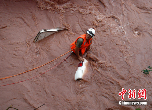 事故現場,墜河的汽車是一輛金杯面包車,車體已經完全掉入周公河中,由于連日暴雨,周公河河水暴漲,水流湍急,墜河車體只露出車尾的一小部分。汽車在洪水的沖刷下還在不斷晃動,隨時有被洪水沖走的可能。