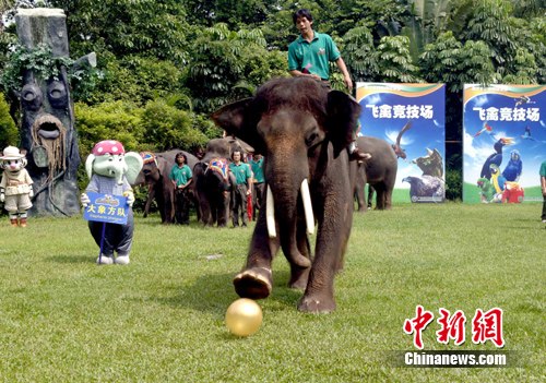 陣容最強大的壓軸方隊是10只大象,它們參加了運動會的球類項目,比賽現場擺了4個大氣球,大象向著觀眾席大腳一踢,觀眾都不自覺地當起守門員,穩穩地把球接住。