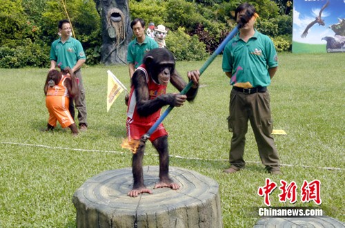 緊接著出場的是猩猩方隊,5只猩猩穿上運動裝,精神抖擻。為了表現訓練成果,他們迫不及待地點起熊熊火棒,觀眾看得驚險萬分,可這些猩猩運動員卻舞得從容自在。隨后,黑猩猩跟黃猩猩還進行了一場拔河比賽。