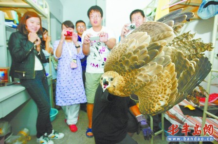 美術(shù)學(xué)院的女生小劉告訴記者,28日傍晚6時許,她第一個回到宿舍,剛進(jìn)門陽臺外突然飛進(jìn)來一只大鳥,沖著她的臉撲來,嚇得她抱頭尖叫,趕緊沖出了宿舍,“我仔細(xì)一看才發(fā)現(xiàn)是一只老鷹,我很害怕,就叫男生來幫忙了。”