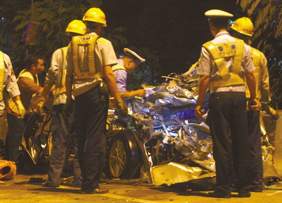 羊城晚報記者昨晚9時許來到北二環高速米龍大橋路段,只見東往西方向車道上,停滿了救援車輛,大批交警、消防員和救援人員在緊張工作中。記者看到,在出事的米龍大橋路肩上,停著兩輛大貨車、一輛黑色小轎車和一輛綠色面包車。大約在9時30分,救援人員從已被撞成廢鐵的黑色小轎車中救出一名男子和一名女子,兩人看上去均年約20多歲。可惜,經現場救護人員診斷,兩人已當場死亡。
