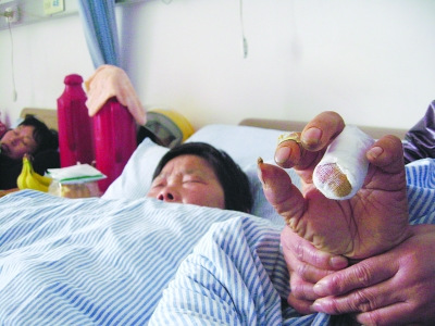 昨天中午,記者在高淳縣人民醫(yī)院見(jiàn)到了邢老太,她此時(shí)躺在病床上,正在掛水,面色異常蒼白,一旁的女兒雙眼通紅,不住地?fù)崦赣H的手臂。“真是太過(guò)分了,他們能這樣對(duì)待一名老人嗎?”女兒哭著告訴記者,那少了的一節(jié)手指就是被城管隊(duì)員硬生生扯斷的。