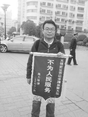 其實我一共做了三面錦旗。最早的一面9月份做的“起訴通用工會法院不受理”,給無錫新區法院的。“不為人民服務”是給勞動保障監察大隊的。第三面還是給法院的,寫的“行政訴訟立案難”,還沒送出去。現在看來第二面最受歡迎。
