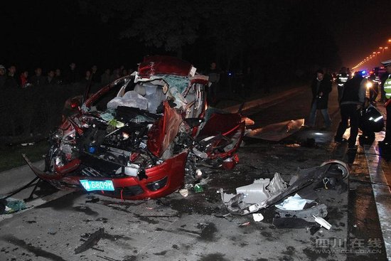 昨晚10時許,成都晚報記者趕到現(xiàn)場時,交警正在勘查事故現(xiàn)場,周圍撒滿了碎片。