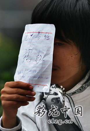 羞澀的表情,略亂的頭發(fā),穿一身白色衣服,旁邊擺一個(gè)旅行包。這個(gè)臉上還有著稚氣的小伙子,用蹩腳的普通話指著紙上的字,有些不好意思地說(shuō):“寫得很不好。”手舉一張紙遮住臉,上面是他自己用鋼筆寫的“此廣告位出租”6個(gè)大字,右下角留的小字標(biāo)有自己的QQ號(hào)和電子郵址。