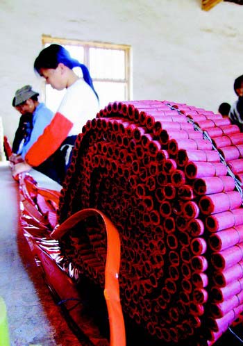 燃放速度可以控制、總重約2900公斤、長(zhǎng)達(dá)23公里的全世界最長(zhǎng)的鞭炮——“棖沖紅炮”,昨日上午在瀏陽(yáng)棖沖鎮(zhèn)坡灣鞭炮廠完成制作,將于今天封裝入庫(kù),將由2人24小時(shí)看守。26日15時(shí)18分至17時(shí),這掛鞭炮將在瀏陽(yáng)國(guó)際花炮節(jié)活動(dòng)中燃放,并現(xiàn)場(chǎng)申請(qǐng)吉尼斯世界紀(jì)錄。