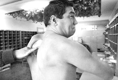 昨天(10月25日)上午,記者在米東區郵政局見到35歲的阿里甫。他一米八的大個子,健壯結實。在同事們的幫助下,他開始演示他的絕技。