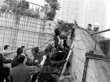 記者趕到現場時,正當消防戰士準備著手解救該男子。記者看到,現場有數百居民圍觀。跳樓男子站在一7層高樓樓頂外側的巨幅廣告牌鋼架上,樓下警方拉起了警戒線。幾名身系保險繩的消防戰士從該樓樓頂慢慢攀爬上了巨幅廣告牌鋼架。驚心動魄的一刻終于發生了,消防戰士將該男子拉住,并用隨身攜帶的安全繩縛住男子身體,將男子從鋼架轉移至樓頂,整個解救過程,歷時40余分鐘。