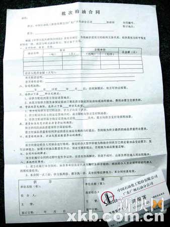 記者又問:“我們能不能簽合同呢?”葉站長說:“當然可以簽!彪S后他當場拿出一份《批次購油合同》,合同上的“供方”就是“中國石油化工股份有限公司廣東廣州石油分公司加油站”。“這些都是正式合同,提貨單位也是我們公司的正式提貨單,發票也是正式發票,合作愉快最重要。”葉站長說。