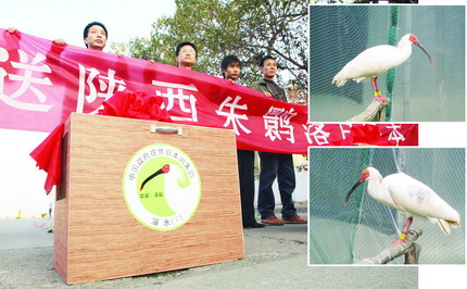 陜西朱鹮保護工作站站長、工程師丁海華一路護送朱鹮飛赴日本。他介紹說,這兩只赴日朱鹮年齡都是4歲,身強力壯,是中日雙方于7 月在洋縣選定,9月底開始隔離護養。雄性朱鹮取名"華陽",雌性的被稱為"溢水"。這名字均來自它們的棲息地陜西省洋縣的地名,華陽是海拔最高的朱鹮野生分布地,而溢水是最大的朱鹮野生繁殖地。 (記者 宋紅梅)