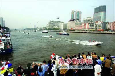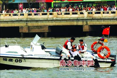 疑犯開著快艇一路狂逃,半路將人質踹入水中;警方救人、擒賊、打撈物證,十幾分鐘內全部完成。昨天,走過百余年歷史、默默守護珠江的廣州水警由幕后走向前臺!鞍倌晁,再創輝煌”2007年廣州警察開放日活動在濱江西路水警碼頭和人民橋至解放大橋之間的珠江河面舉行。廣州水警向萬名圍觀市民演示了水上反劫持抓捕行動。這是第六屆廣州“警察開放日”活動的重頭戲。此外,水上表演還包含消防船表演、飛行表演等多個項目。