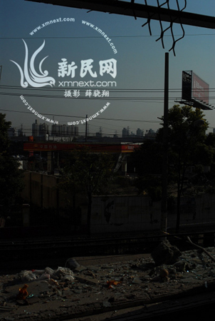 浦三路上的居民小區(qū)、商鋪很多,一些路人受了輕傷,店鋪的玻璃被砸破。浦三路830號(hào)是一家花鳥市場(chǎng),距離爆炸現(xiàn)場(chǎng)約有300米遠(yuǎn)。在不到50平方米的花鳥市場(chǎng)空地上,全都是飛過來的碎石、管子。在市場(chǎng)門口,一輛自行車倒落在地,另外還有一輛裝有鐵板的三輪車,“他們的頭都被砸破了,全都送醫(yī)院去了。”市場(chǎng)內(nèi)的一位王老板指著自己的腦袋說,“我當(dāng)時(shí)騎著助動(dòng)車出去,就看到一大片石頭飛過來,我們幾個(gè)人都被砸到了,我都被砸了一個(gè)‘瘤’出來。”