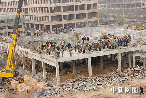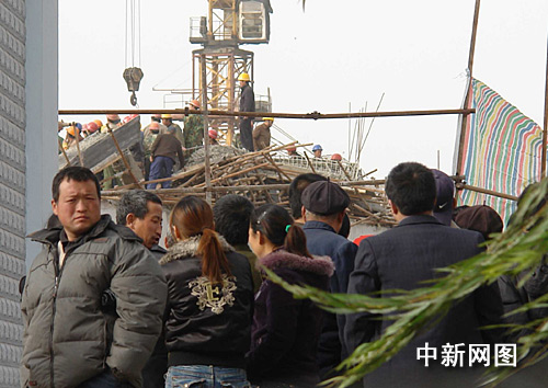 出事地點緊鄰侯馬北方輕工城,當地警方已對事故現場周圍二百米范圍進行封鎖。事故樓房已經被工地工人用三米多高的編織帶圈起,記者當天下午一時三十分到現場時,只見兩輛大型吊車和數百名戴有安全帽的工人在緊張的進行搶救。