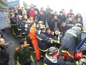 情況緊急,交警迅速調來清障車,將前面一輛卡車吊離;在騰出足夠的空間后,消防隊員馬上用機動鏈鋸,在變形的車頭上鋸開一道口子,再用擴張器進行擴張。但由于車頭變形嚴重,擴張器“使不上勁”,破拆進行得異常緩慢,而此時受困司機的呻吟越來越微弱。“不如系上繩子將鋼板拉翻”,現場一位群眾建議。消防隊員忙找來纜繩,纜繩的一頭拴在卡住司機身體的鋼板上,另一頭剛垂了下來,很多現場的群眾就趕忙走上前來和十多名消防隊員一起抓住了繩子,一齊使勁后鋼板卻沒有絲毫松動。力量不夠!見此情景,旁觀的其他群眾馬上也加入到了拉繩子的行列中來,很多群眾都光著手死死地拽著鋼繩,“一、二、三”,壓在司機身上的鋼板終于被掀翻,司機得救了,現場一片歡呼聲。但躺在駕駛位后面的另一位男子已不治身亡。受傷司機介紹,事發時,當地突然出現了濃霧,視線受阻,前方卡車突然剎車后,他就一頭撞了上去。 (水梅 路遙 宏偉 王國柱)