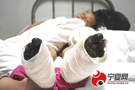 因家境貧寒,母親帶著兒子出門討飯,因迷路在寒風刺骨的大山里被困5天5夜后被人解救,母子倆的生命雖無大礙,但7歲的兒子楊二喜的雙腳已嚴重凍傷面臨截肢。12月11日,記者在寧夏醫學院附屬醫院見到了正在接受治療的楊二喜,昨晚9時,本報(注:新消息報)副總編輯杜海濤代表新消息報編委會,為楊二喜送去鮮花和救助金。