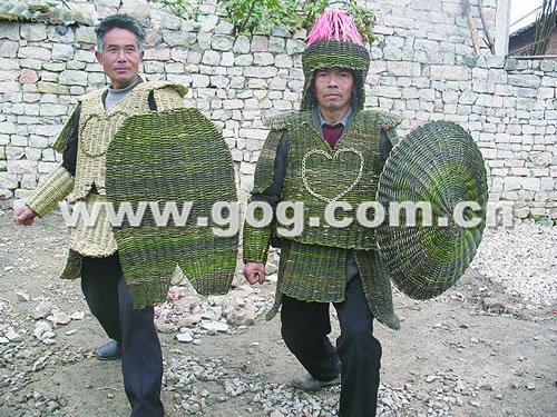 近日,被蜀國丞相諸葛亮用火燒死的藤甲兵在安順“復活”(如圖)。記者昨日在安順開發區歪寨村看見,該村村民根據老人的回憶復制的兩副藤甲已經全部完成,村民穿在身上,活像三國時期曾大敗蜀軍的“藤甲兵”,令人驚奇不已。