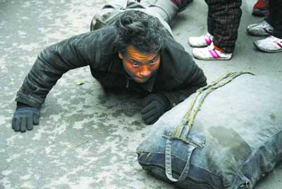 3時30分許,記者趕到東三馬路。一穿著灰色上衣、黑色褲子的男子雙膝跪地,雙手撐在地上,兩手一前一后地向東緩慢爬行。他身前放著一碩大的淺藍色帆布包裹,每爬一步他都先用手把帆布包往前推去。男子約40歲,凌亂的頭發中夾雜不少白發,從頭到腳均是臟兮兮的。