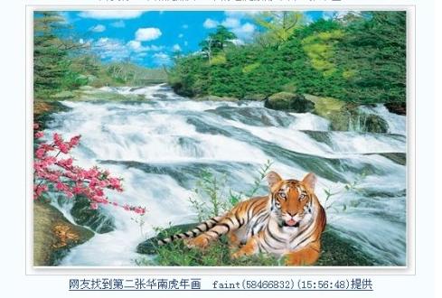 2、2007年11月15日晚九時許,網友"攀枝花xydz"在色影無忌華南虎臨時論壇里發帖稱:"老虎是假的。我今天仔細看我家的一副掛在墻上的老虎畫,除了耳朵不一樣,哪里都是一樣的,連老虎的紋路都是一樣的。但我不知道怎么傳圖,我已經照下來了。"